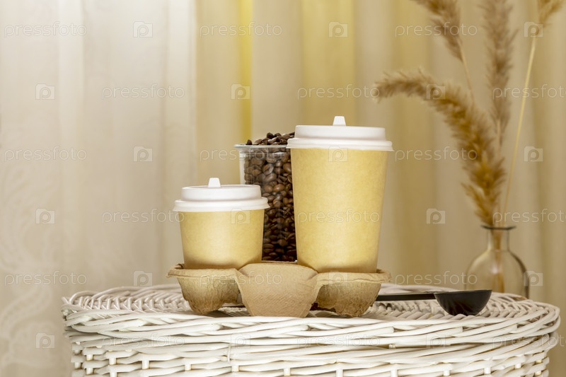 Два одноразовых экологически чистых картонных стаканчика в плетеной корзине в светлом интерьере