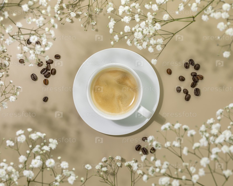 Чашка натурального кофе и кофейных зерен на бежевом фоне с белыми цветами и тенями. Весенняя утренняя композиция с чашкой свежего горячего эспрессо. Плоская планировка
