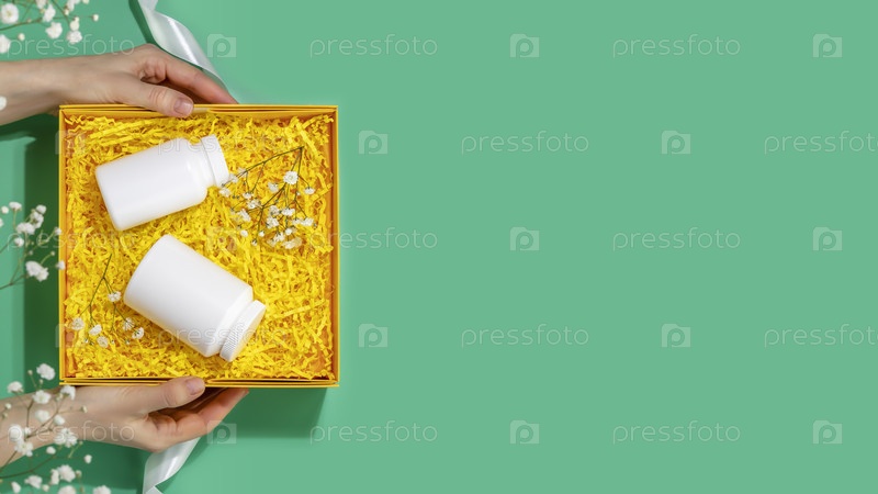 Женские руки держат подарочную коробку с набором витаминов и добавок