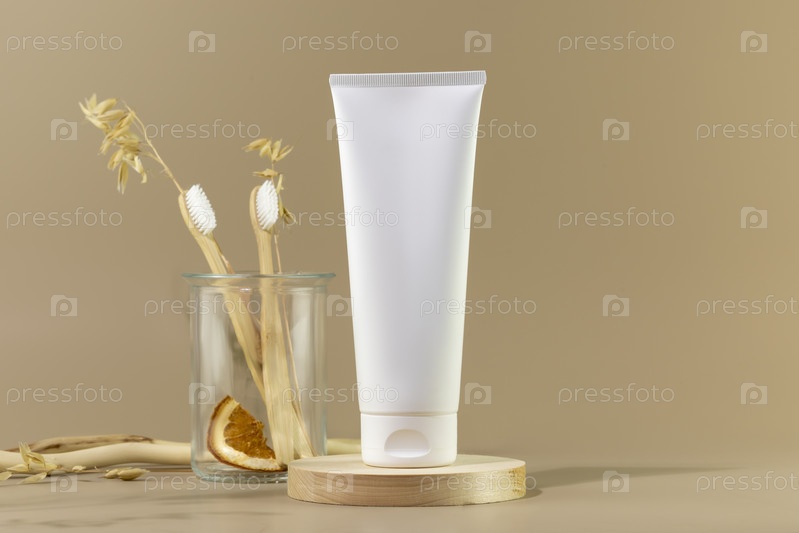 Натуральная зубная паста, зубные щетки на бежевом фоне с местом для текста