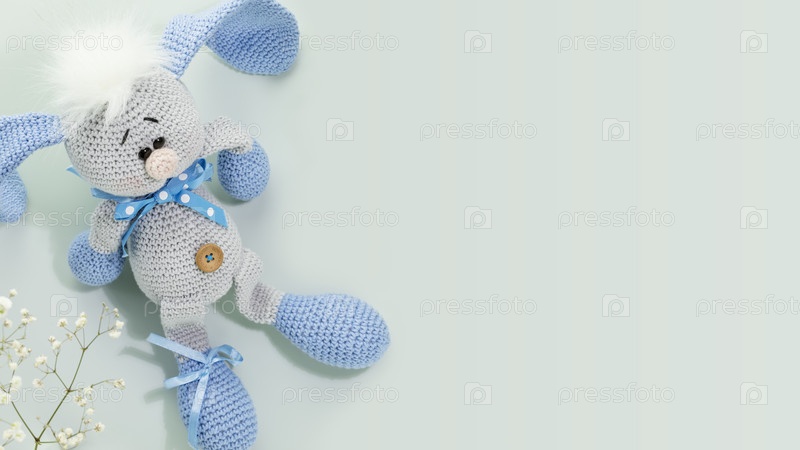 Вязаная крючком игрушка-кролик на синем фоне с белыми цветами и местом для текста. Мягкие игрушки ручной работы в виде пасхального кролика