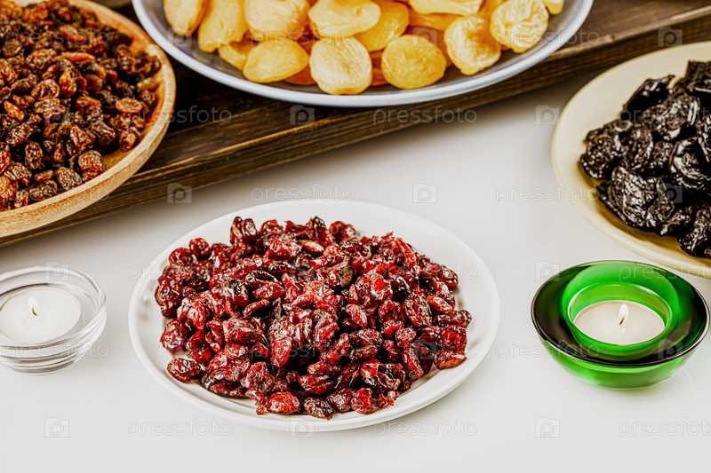 Рамадан пищевая композиция с курагой, клюквой, изюмом и черносливом на тарелках на белом фоне со свечами. Ассорти из сухофруктов. Здоровая сладкая закуска - смесь органических сухофруктов