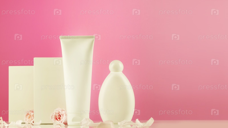 Макет натуральной косметики на основе розовых цветов. Белый косметический тюбик и флакон с белыми коробками на розовом градиентном фоне с нежными розами и лепестками роз. Стиль мягкого фокуса, пространство для копирования