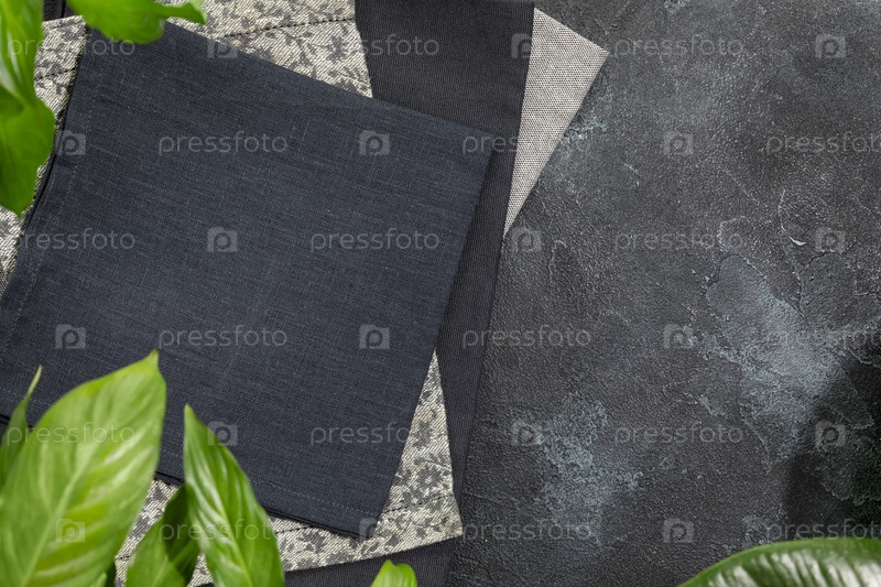 Сложенные черные салфетки на черном фоне с зелеными листьями и местом для копирования. Экологичный макет для демонстрации или монтажа блюд, еды или моющего средства. Витрина для презентации. Плоская раскладка