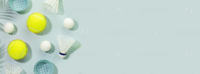 Летний спортивный баннер с теннисными мячами, мячами для настольного тенниса и воланами на синем фоне с тенями пальм. Здоровый образ жизни. Теннис, настольный теннис, бадминтон. Размер баннера, место для копирования
