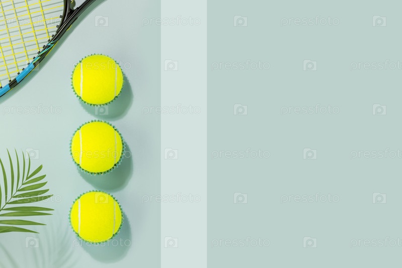 Теннисные мячи и теннисная ракетка на синем фоне корта с местом для текста
