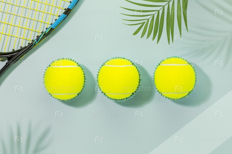 Карточка соревнований по теннису. Спортивная композиция с желтыми теннисными мячами и теннисной ракеткой на синем фоне корта с пальмовыми листьями и тенями. Спорт и здоровый образ жизни. Плоская планировка
