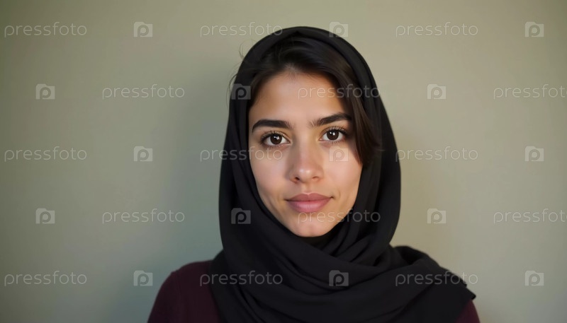 Очаровательная молодая женщина из Газы стоит уверенно, ее темный хиджаб обрамляет ее лицо, когда она смотрит прямо перед собой. Ее выражение отражает чувство решимости и изящества