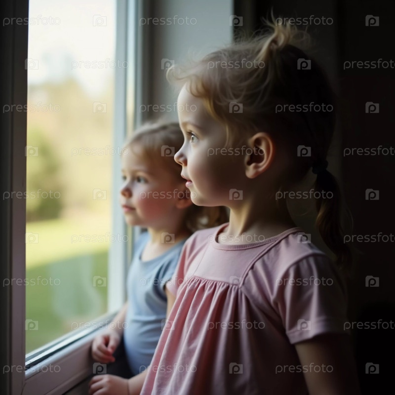 Двое детей стоят у окна, их лица полны удивления, когда они смотрят наружу. Солнечный свет проникает сквозь него, освещая их любопытные лица и яркую зелень за окном