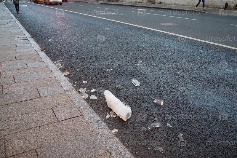 Большой кусок льда лежит на тротуаре рядом с разбросанными осколками в оживленном городском районе. Опасность падения льда с крыши. Зимняя погода. Возможность получения травмы. Очистка крыш от снега