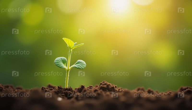 Нежное молодое растение тянет свои нежные зеленые листья к теплому солнечному свету, прекрасно себя чувствуя на темной, плодородной почве, начиная свой путь в тихом саду ближе к вечеру