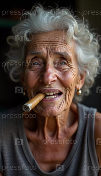 Пожилая женщина с Кубы демонстрирует лучезарную улыбку, держа сигару в зубах, воплощая тепло и жизнь в своих морщинах. Ее присутствие отражает богатое культурное наследие