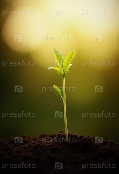 Молодое растение появляется из плодородной почвы, его нежные листья греются в теплых солнечных лучах, символизируя обновление и надежду в тишине рассветных объятий. Генеративный ИИ