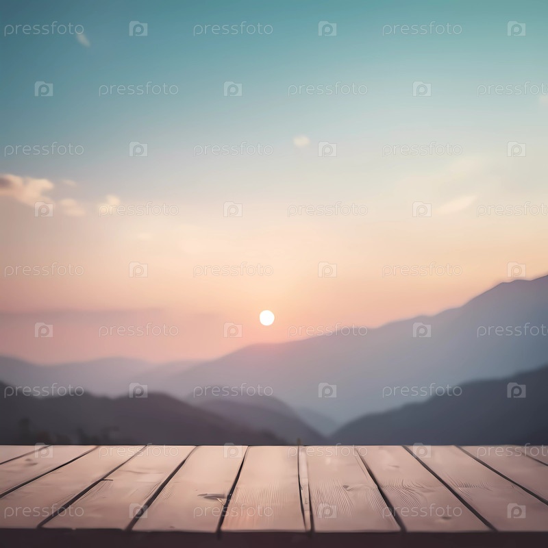 Мягкие пастельные тона плавно смешиваются на небе, когда солнце плавно опускается за далекие горы, создавая умиротворяющую атмосферу над деревянной поверхностью, ожидающую творческого вдохновения. Генеративный ИИ