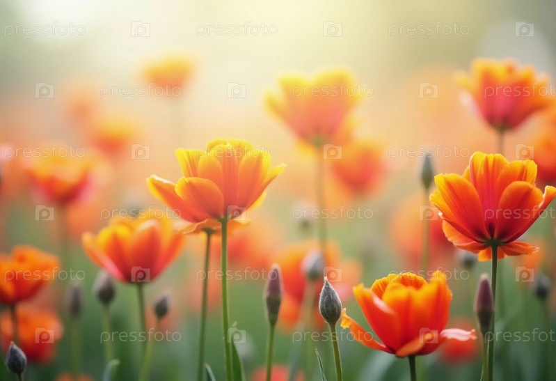 Блестящие апельсиновые цветы нежно колышутся на ветру, окруженные зеленым полем. Мягкий фокус создает неземную атмосферу, идеальную для релаксации и размышлений Генеративный ИИ