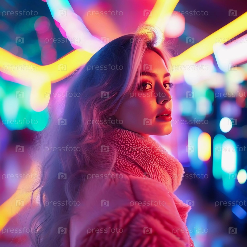 Среди оживленной аркады, полной электрических красок, женщина с развевающимися волосами олицетворяет грацию и уверенность, оглядываясь через плечо, освещенная ярким светом. Генеративный ИИ