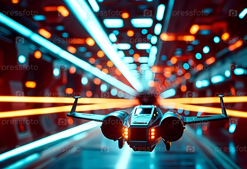 Космические корабли мчатся по ярким космическим траекториям, оставляя за собой следы света, исследуя неизведанное пространство, демонстрируя передовые технологии генеративного искусственного интеллекта