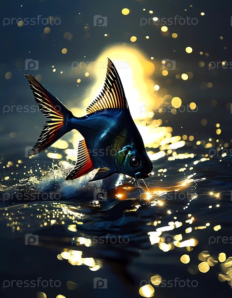 Яркая рыба выпрыгивает из воды, создавая брызги, когда она ловит теплый, золотистый свет заката. Окружающая поверхность мерцает очаровательными боке-бликами Генеративный ИИ