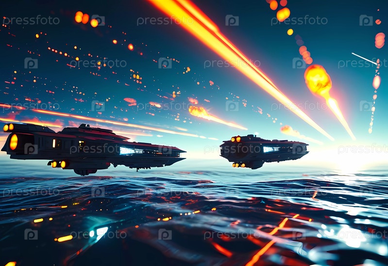 В потрясающей демонстрации энергии и движения два космических корабля пролетают сквозь ослепительные астральные потоки, оставляя за собой следы света, освещающие таинственный космос вокруг них. Генеративный ИИ