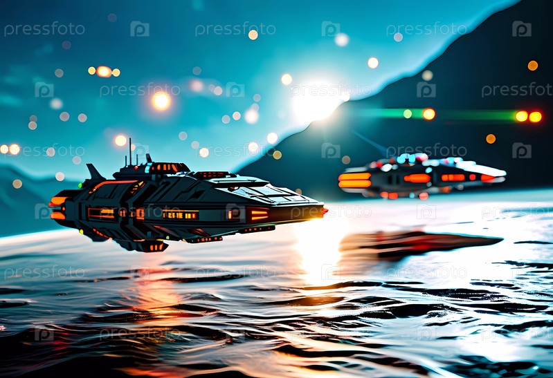 Элегантные космические корабли легко скользят по сверкающему пространству, отражая небесные огни и перемещаясь по космическим водным путям в неизведанной вселенной, полной возможностей. Генеративный ИИ