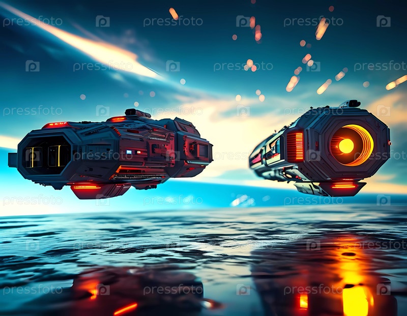 В необъятности вселенной два передовых космических корабля легко перемещаются, оставляя за собой светящиеся следы. Их гладкие конструкции ярко сияют на фоне космических чудес Генеративный ИИ