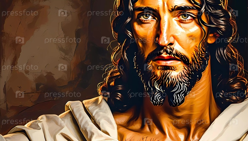 Поразительное изображение Иисуса Христа, запечатленного в спокойном созерцании. Его выразительный взгляд отражает глубокую мудрость, помещенную на мягко освещенный фон. Генеративный ИИ