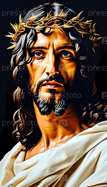Фигура Иисуса Христа, украшенная терновым венцом на темном фоне, завораживает своим глубоким взглядом, олицетворяя силу и сострадание. Генеративный ИИ
