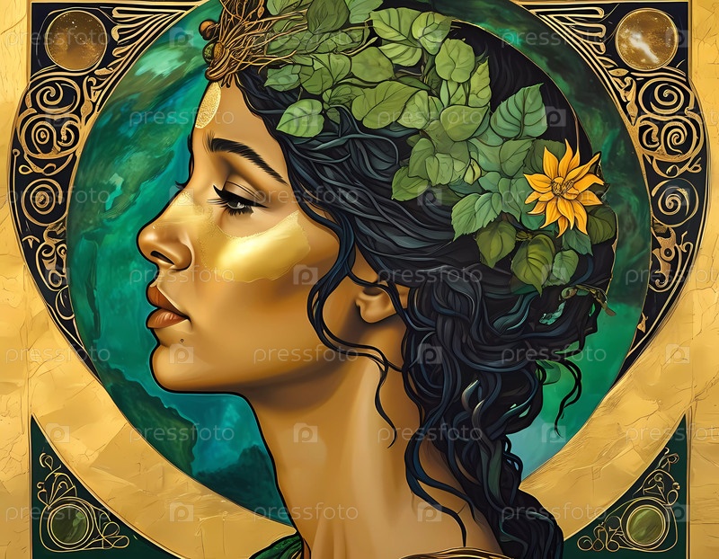 Олицетворяя дух Геи, это произведение искусства демонстрирует женщину, украшенную листьями и подсолнухом, что символизирует ее связь с природой и щедростью земли. Генеративный искусственный интеллект
