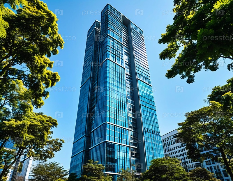 Поразительный высотный небоскреб возвышается, его стеклянный фасад мерцает под ясным голубым небом. Пышные зеленые деревья окружают здание, смешивая городскую жизнь с красотой природы Генеративный ИИ