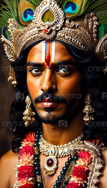 Захватывающее изображение Господа Кришны, демонстрирующее любовь и сострадание посредством изысканных украшений, ярких нарядов и выразительного видения, воплощающего древнюю мудрость в жизнь. Генеративный ИИ