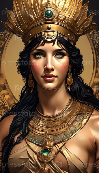В небесной обстановке потрясающая фигура воплощает Афродиту, украшенную замысловатыми золотыми украшениями и короной, источая вечную красоту и грацию. Ее пленительный взгляд очаровывает всех Генеративный ИИ
