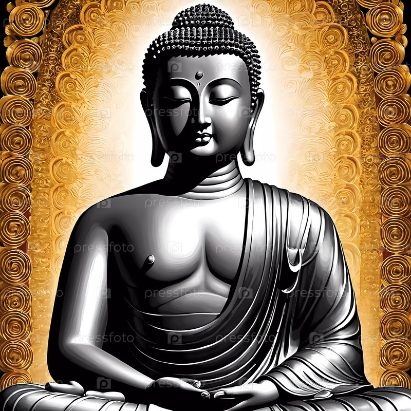 Изящный черный Будда сидит в медитации, символизируя спокойствие и внутренний мир, украшенный изысканными золотыми узорами, которые усиливают спокойную атмосферу обстановки. Генеративный ИИ