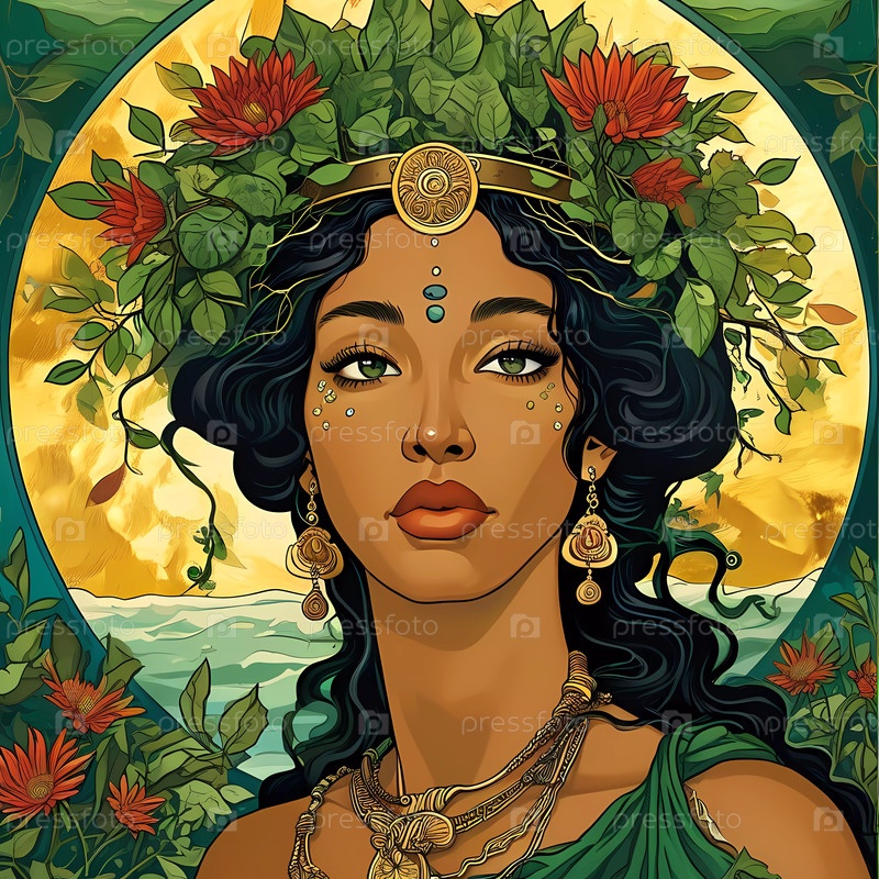 Окруженная пышной зеленью и цветочными акцентами, богиня Гайя излучает сущность земли, демонстрируя свою божественную связь с природой, гармонией и жизнью. Генеративный ИИ