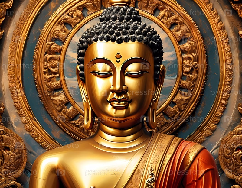 Великолепная статуя Будды, украшенная золотом и яркими цветами, стоит в прекрасном резном храме. Мягкий свет усиливает безмятежную атмосферу, приглашая к созерцанию Генеративный ИИ