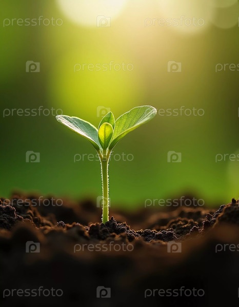 Из темной, питательной почвы появляется яркое молодое растение, тянущее свежие зеленые листья к теплому солнечному свету, символизируя рост и новые начинания в природном заповеднике Генеративного искусственного интеллекта