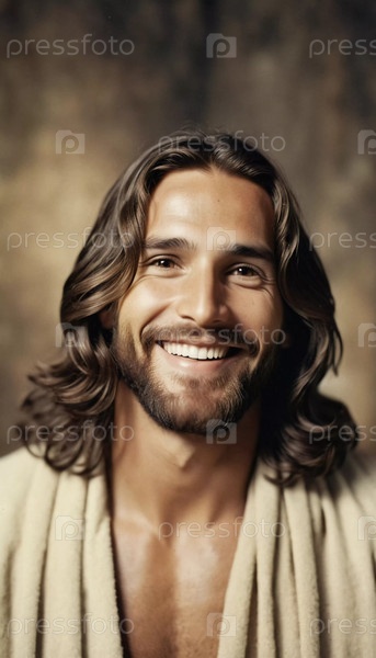 Мужчина воплощает радость и сострадание, с пленительной улыбкой, которая вселяет надежду. Его длинные волосы и нежное выражение лица отражают ауру мира, приглашающую связь и любовь Генеративный ИИ