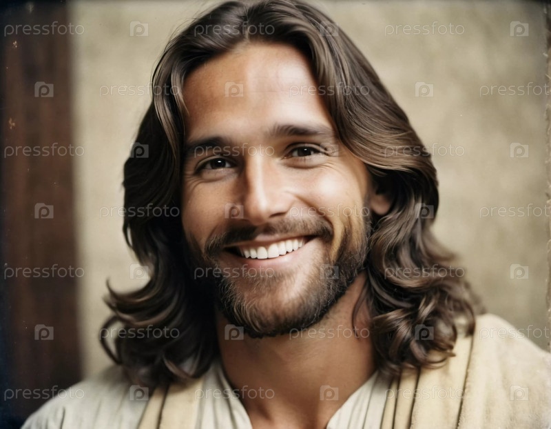 Радостная, харизматичная фигура с развевающимися волосами излучает тепло и доброту, окруженная атмосферой, вызывающей спокойствие и надежду, приглашающей к внутреннему размышлению и утешению. Генеративный ИИ