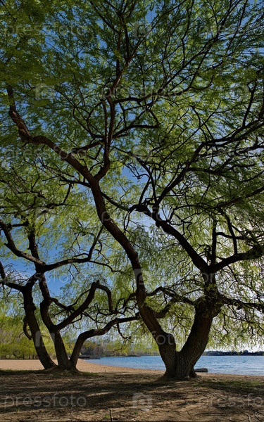 Кыргызстан. Лучи восходящего утреннего солнца над берегом озера Иссык-Куль пробиваются сквозь зеленые кроны ив