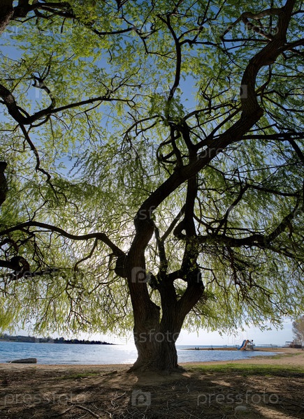 Кыргызстан. Лучи восходящего утреннего солнца над берегом озера Иссык-Куль пробиваются сквозь зеленые кроны ив