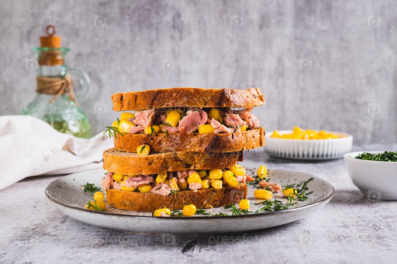 Вкусные сэндвичи с тунцом, кукурузой и зеленью на зерновом хлебе