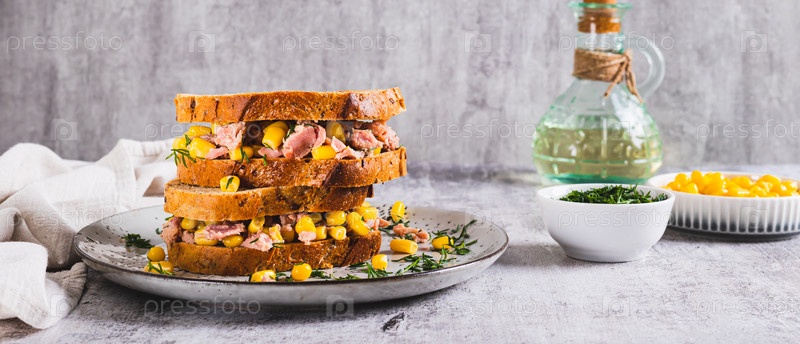 Вкусные сэндвичи с тунцом, кукурузой и зеленью на зерновом хлебе веб-баннер