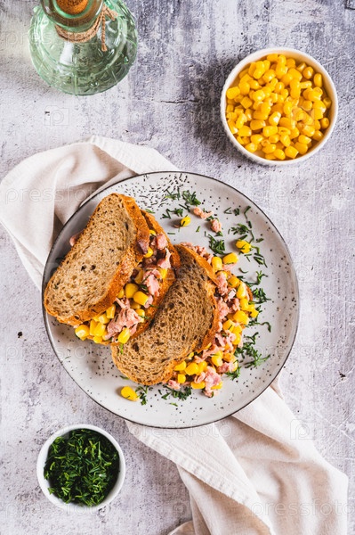 Салат из тунца и кукурузы на зерновом хлебе на тарелке на столешнице и вертикальный вид