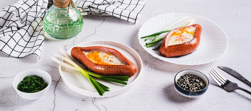 Жареное яйцо в сосиске в виде хачапури на тарелке на столе веб-баннер