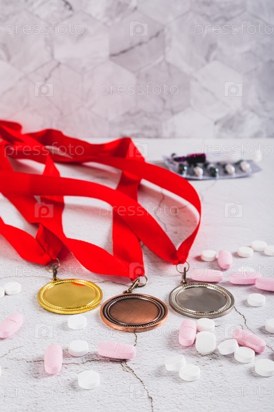 Концепция допинга в спорте, медали, таблетки и шприц на столе вертикальный вид