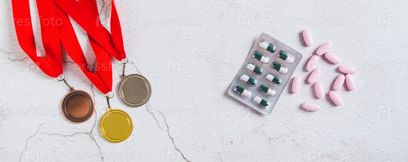 Таблетки и инъекции для допинга спортсменов на светлом фоне вид сверху веб-баннер