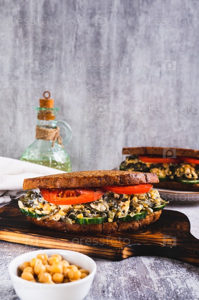 Вегетарианский сэндвич с водорослями, нутом, огурцом и помидором на зерновом хлебе вертикальный вид