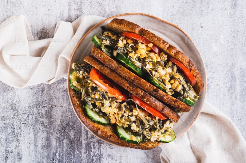 Крупный план сэндвича с водорослями, нутом, огурцом и помидором на зерновом хлебе, вид сверху