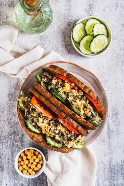 Овощной бургер с нутом и салатом из морских водорослей на доске сверху и вертикальный вид