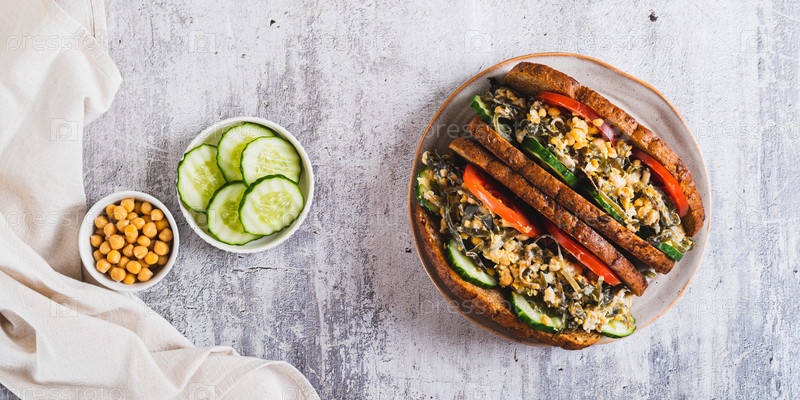 Овощной бургер с нутом и салатом из морских водорослей на доске вид сверху веб-баннер