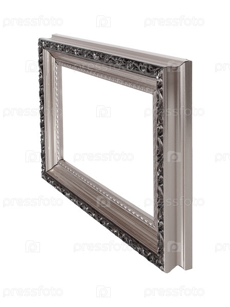 Серебряная рамка для картин, зеркал или фото в перспективе, изолированная на белом фоне. Элемент дизайна с обтравочным контуром